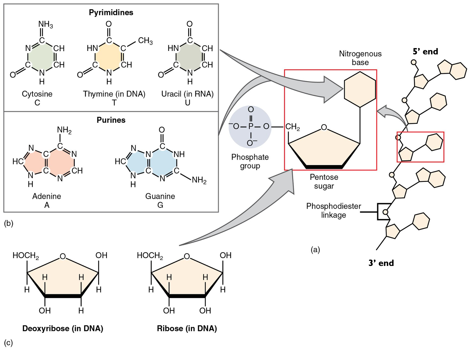 <figure><img src="https://3514673221-files.gitbook.io/~/files/v0/b/gitbook-x-prod.appspot.com/o/spaces%2FdDE3NSiCXcu5YQDQmgdU%2Fuploads%2F9VHyGsQBAnF1DplpQCYk%2FFig_24_nucleic_acid.png?alt=media&#x26;token=66dac95d-165a-4495-8a8a-40fdc902a603" alt=""><figcaption><p>Nucleotides make up nucleic acids<br>(a) Each nucleotide contains a pentose sugar, a phosphate and a nitrogenous base<br>(b) Nitrogenous bases<br>(c) Fice-carbon sugars of DNA and RNA<br>Image source:<br>OpenStax College - Anatomy &#x26; Physiology, Connexions Web site. http://cnx.org/content/col11496/1.6/, Jun 19, 2013., CC BY 3.0, https://commons.wikimedia.org/w/index.php?curid=30131164</p></figcaption></figure>