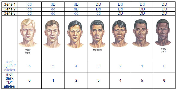 <figure><img src="https://3514673221-files.gitbook.io/~/files/v0/b/gitbook-x-prod.appspot.com/o/spaces%2FdDE3NSiCXcu5YQDQmgdU%2Fuploads%2FVyxo5v3UZ0ilJB1ss541%2FFig_79_skin_tones.jpg?alt=media&#x26;token=b9787f2d-e0af-4233-941d-42bd8767bc6c" alt=""><figcaption><p>A simplified model of polygenic inheritance of skin colour</p></figcaption></figure>