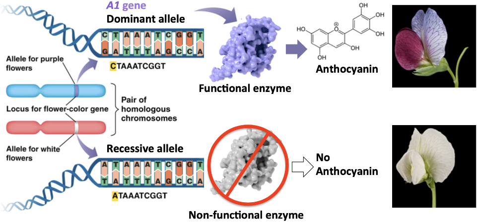 <figure><img src="https://3514673221-files.gitbook.io/~/files/v0/b/gitbook-x-prod.appspot.com/o/spaces%2FdDE3NSiCXcu5YQDQmgdU%2Fuploads%2Flx1no57FrlLYH8sSXLsJ%2FFig_77_peas_pigment.png?alt=media&#x26;token=64d31528-cbbc-47b8-af00-a0bb1839143a" alt="" width="563"><figcaption><p>Alleles are variants of a nucleotide sequence in a gene</p></figcaption></figure>